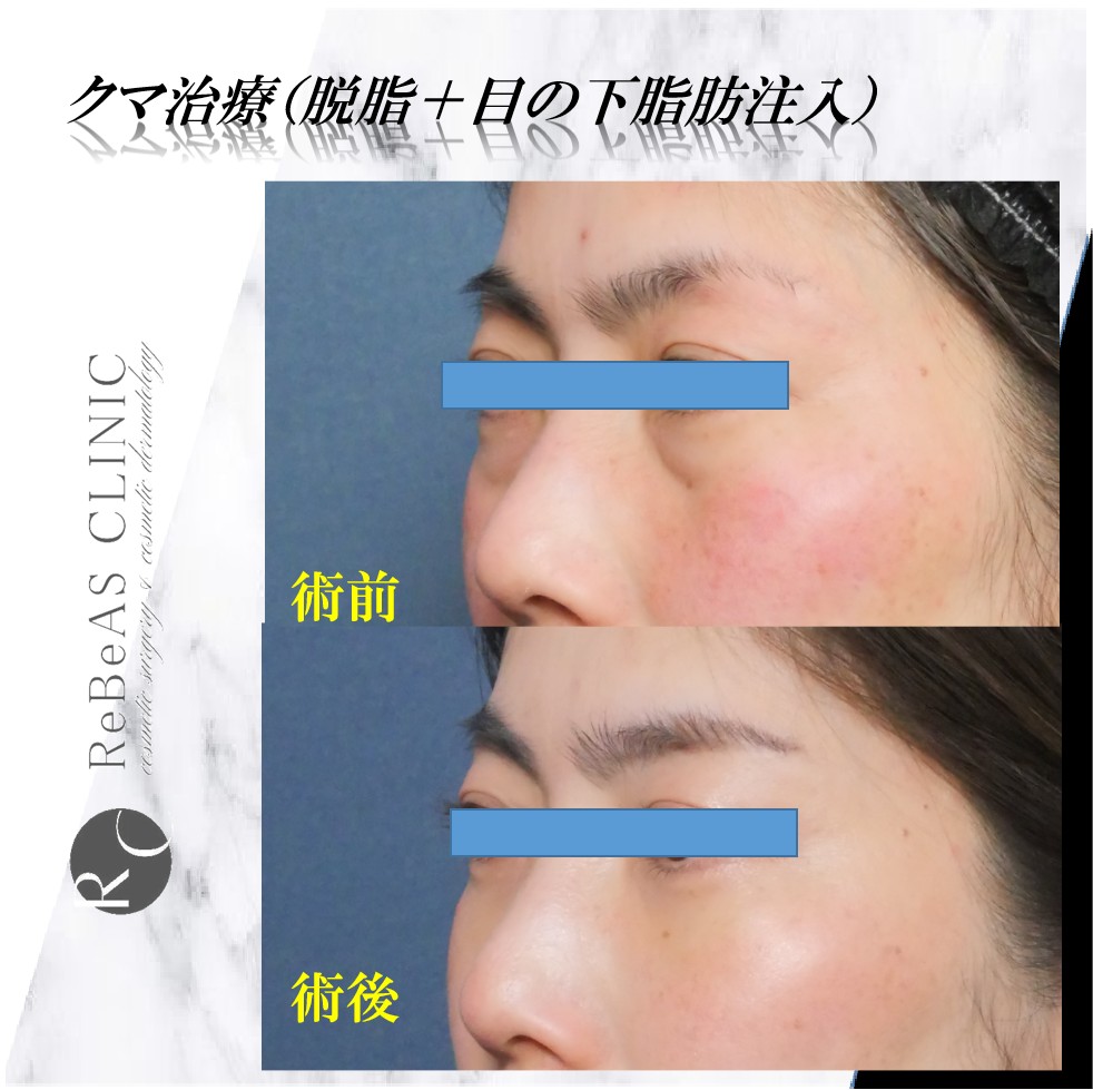 今回の施術は目の下の脂肪注入と眼窩脂肪脱脂を行っています。はれ、内出血が出ることがありますが1~2週間で落ち着いてきます。脂肪採取部位に軽い筋肉痛の痛みが出ることがありますが数日~1週間程度で改善します。