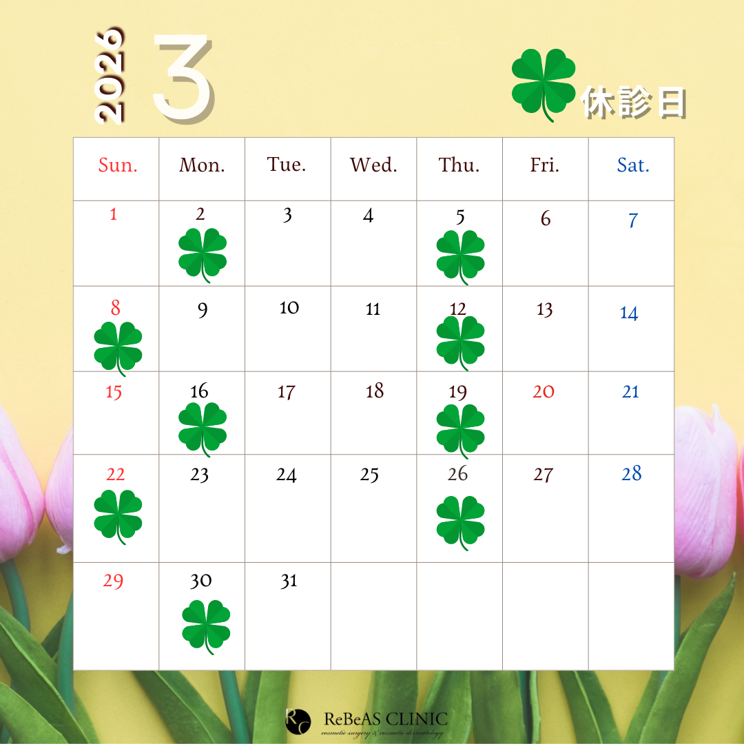 2026年3月の休診日|ReBeAS CLINIC(レビアスクリニック)|福岡市中央区の美容外科、美容皮膚科